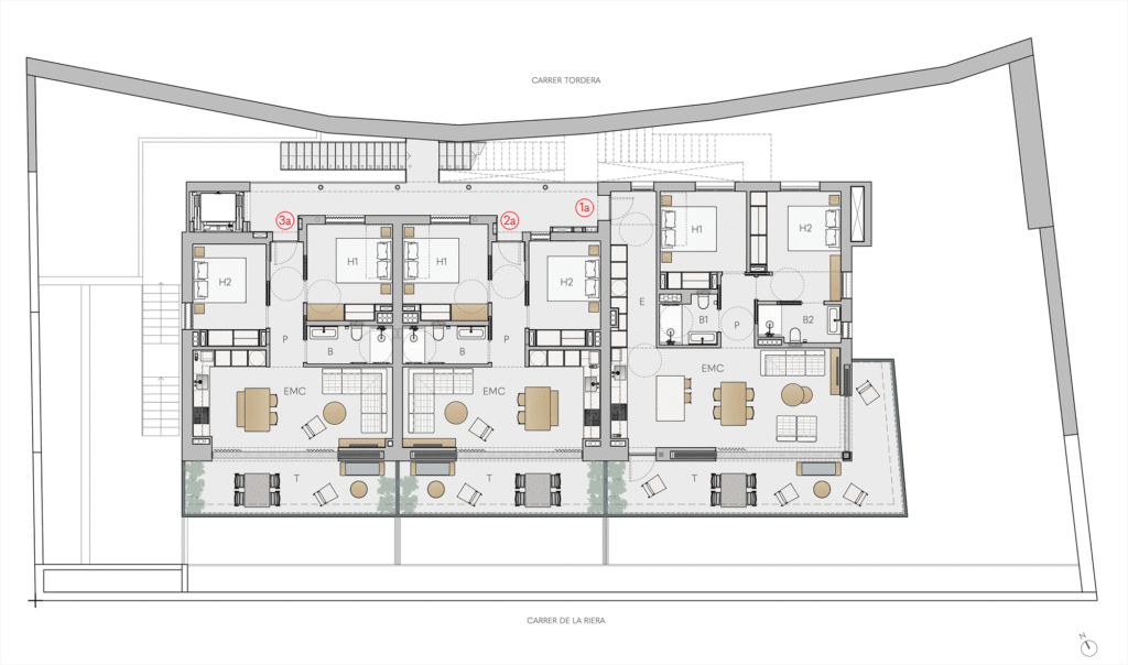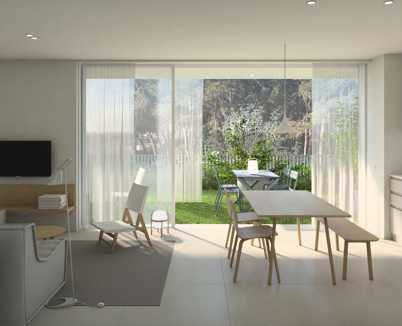 Els apartaments de Tamariu destaquen per uns acabats elegants i duradors que combinen disseny i funcionalitat. Els terres de parquet aporten calidesa als espais, mentre que el gres porcel·lànic garanteix resistència i fàcil manteniment a les zones comunes.